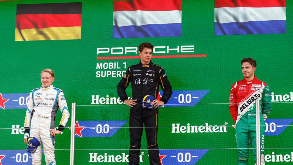 Der Rennfahrer Janne Stiak aus dem Team Target Competition lieferte beim siebten Lauf des Porsche Mobil 1 Supercup auf dem Circuit Zandvoort erneut eine starke Vorstellung ab. Vor vollen Tribünen und insgesamt 305.000 Zuschauern am Formel-1-Wochenende an der niederländischen Nordseeküste fuhr der 18-Jährige aus Steinhude bei Hannover zum sechsten Mal in diesem Jahr als Zweitbester aufs Rookie-Podium. Als erfolgreichster deutscher Starter und mit Gesamtplatz sechs im Feld von 29 identischen Porsche 911 GT3 Cup untermauerte der Förderpilot der ADAC Stiftung Sport seine starke Form im internationalen Markenpokal. |